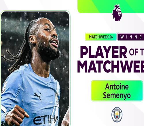 官方:曼城前锋塞门约当选英超第26轮最佳球员