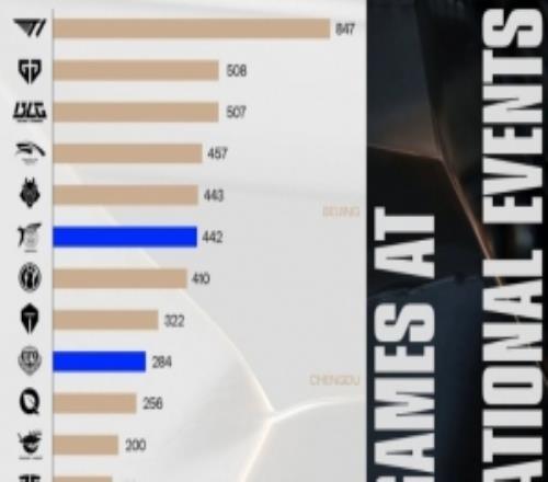 电竞体育10月12报道 LCP官推发布本次世界赛各战队选手参加国际赛事(先锋赛/MSI/S赛)场次之和,T1居首,GEN第二,BLG位列第三;