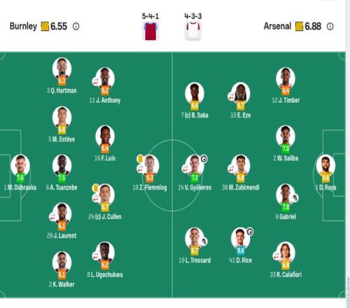 阿森纳首发:1-拉亚、12-廷伯、2-萨利巴、6-加布里埃尔、33-卡拉菲奥里(72’5-因卡皮耶、)、41-赖斯、36-苏维门迪(76’16-诺尔高)、10-埃泽(72’22-恩瓦内里)、7-萨卡、19-特罗萨德、14-约克雷斯(46’23-梅里诺)。