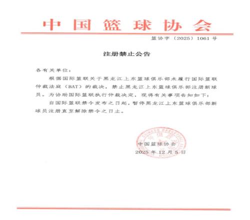 中国篮协12月5日公告,自国际篮联禁令发布之日起,暂停黑龙江上东篮球俱乐部新球员注册直至解除禁令之日止。