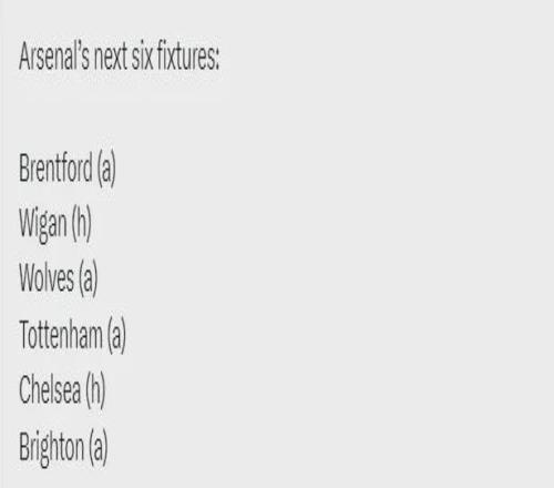 阿森纳未来6场比赛:客战布伦特福德、主战维冈、客战狼队、客战热刺、主战切尔西、客战布莱顿。