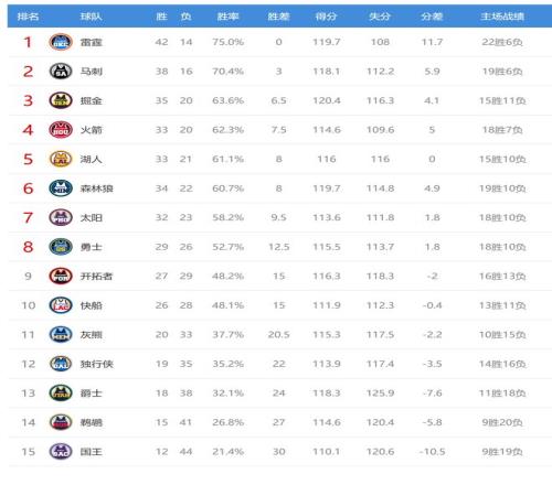 雄鹿排名东部第12,雷霆惨败给残阵雄鹿,出乎了业界预料,雷霆输球后42胜14负,继续排名西部第一,不过在全联盟的排名被活塞反超,活塞成为联盟第一,雷霆变成第二。雷霆输球给马刺送上好礼,马刺只比雷霆多输2场了,这个差距并不大,马刺有希望冲击西部第一了。