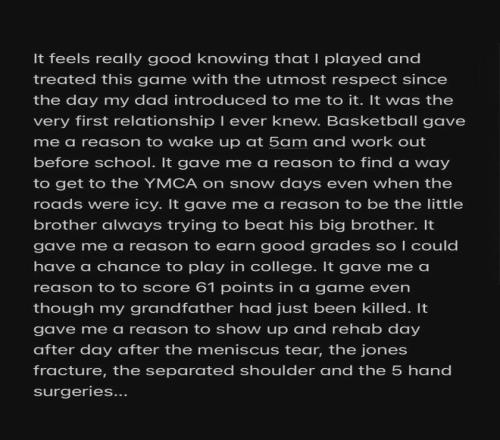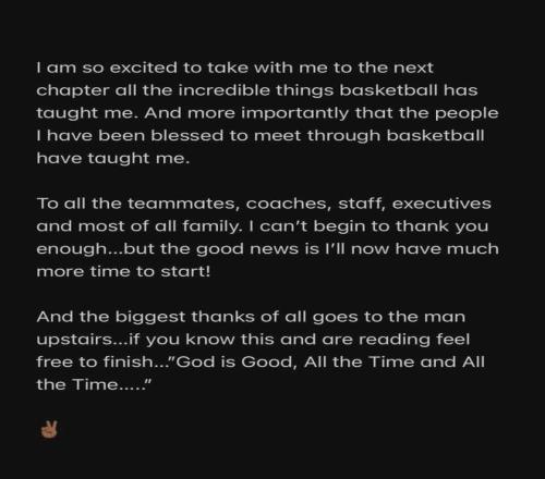 作为"NBA球员"的这一篇章已经结束,但篮球这项运动,早已刻进我的DNA,永远不会离开我。